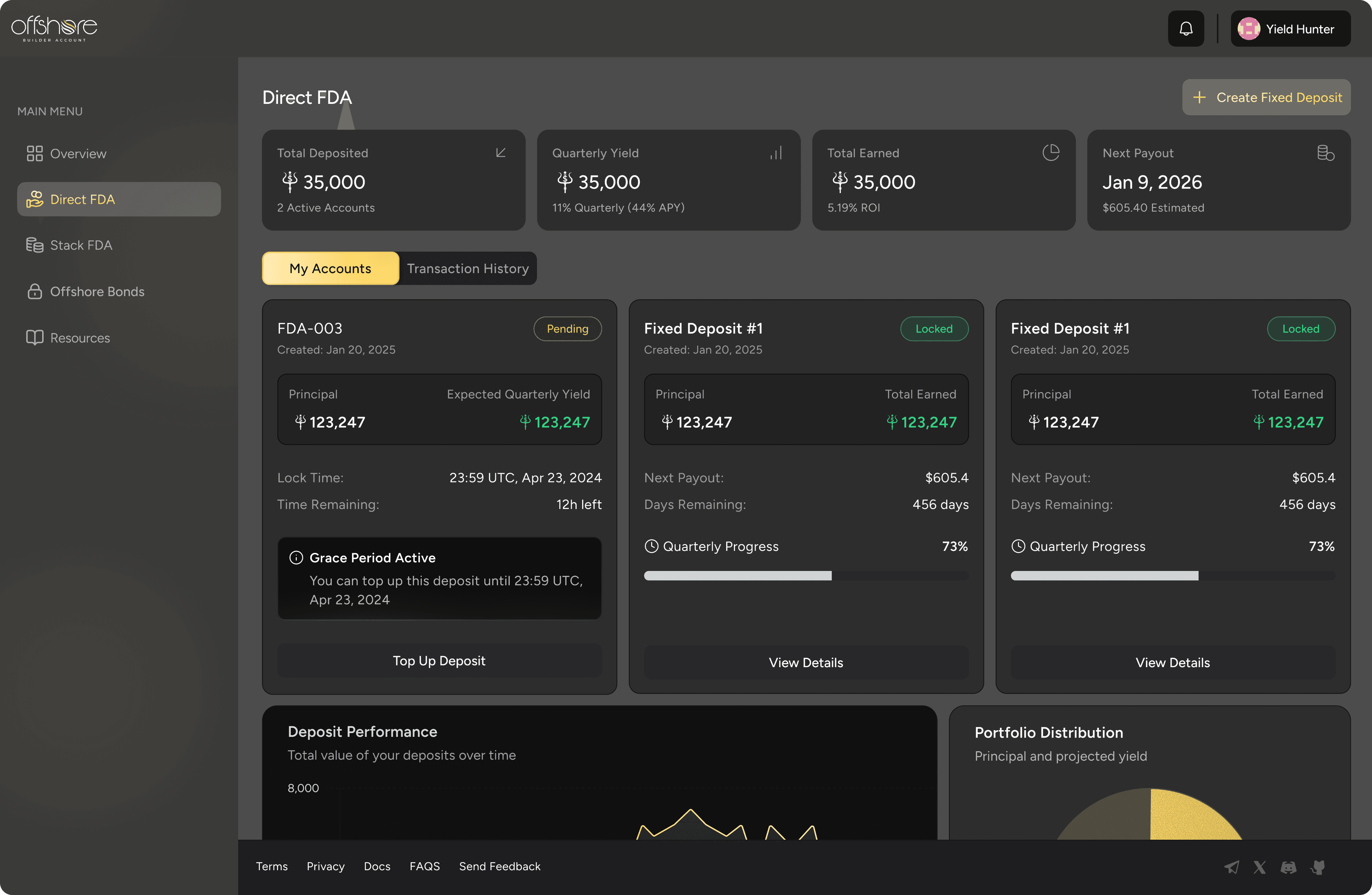 Direct FDAs are hybrid instruments that combine the utility of a business checking account with the performance of a high-yield fixed deposit. While deposits yield at 44% yearly and are held for 24 months, earnings are accessible every quarter; balancing flexibility with disciplined growth.