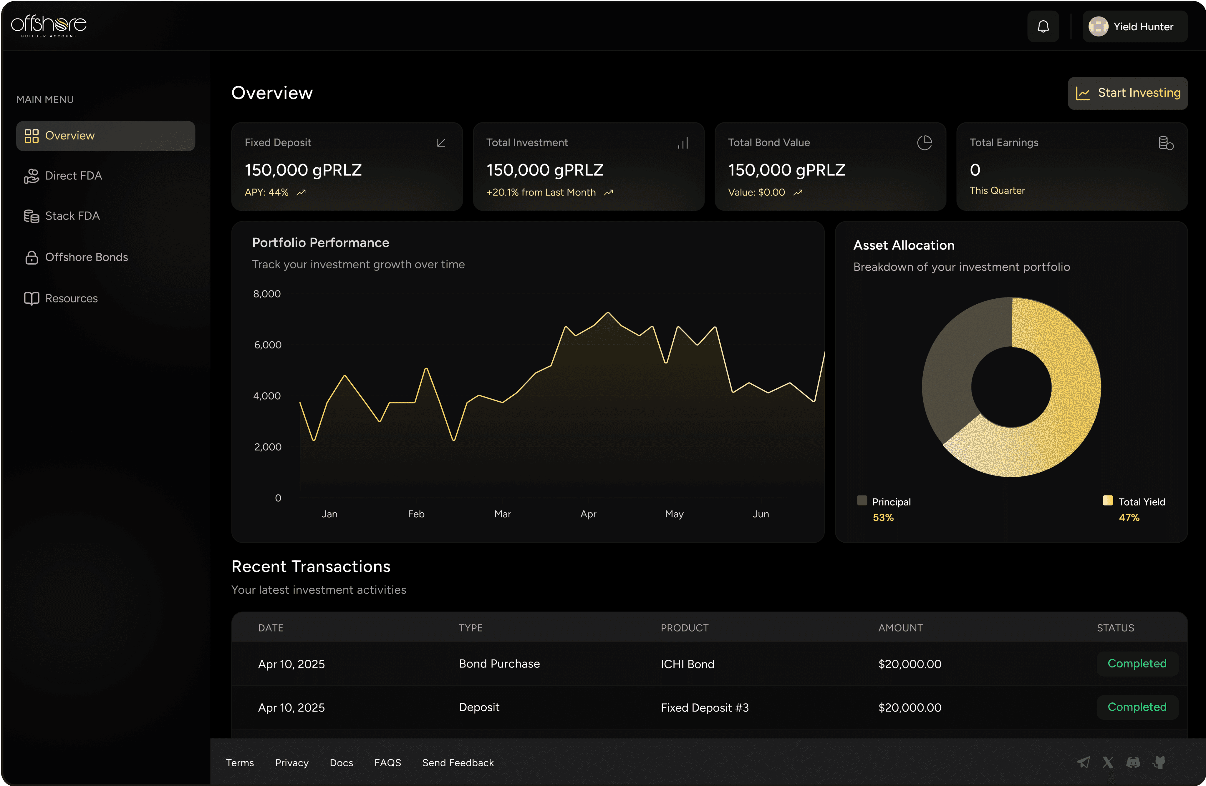 As a VMCC Builder, you have access to the Offshore Builder Account; a purpose-built, decentralized banking application that generates the operating capital needed to grow your company and produce resources needed to support the development of the City of Atlantus.