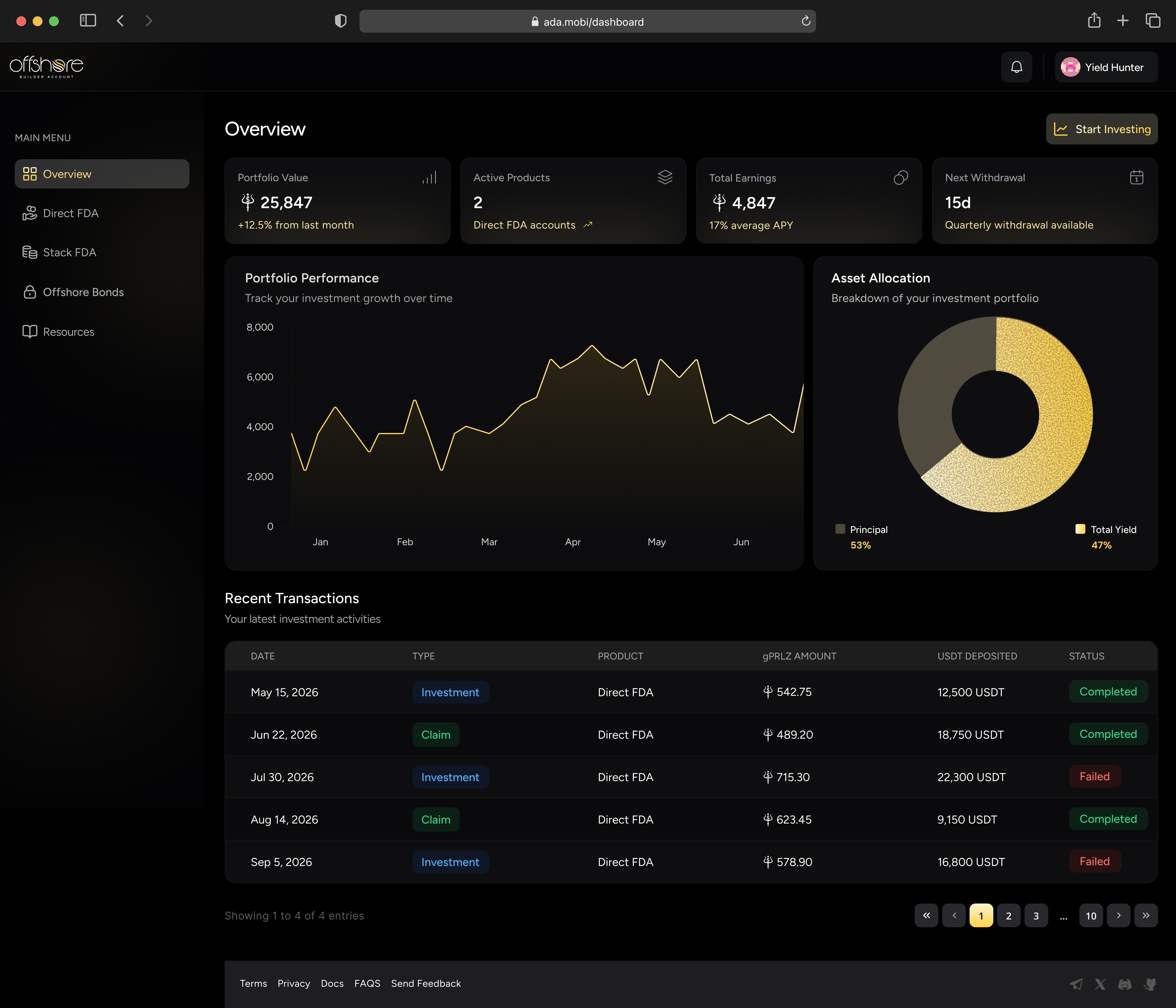 At the core of every Offshore Builder Account is SXRN (pronounced Siren); ADA's proprietary AI-driven quantitative finance protocol. SXRN analyzes market conditions, adapts strategy, and rebalances portfolios in real time, making Offshore Builder Accounts dynamic, performance-optimized financing engines.
